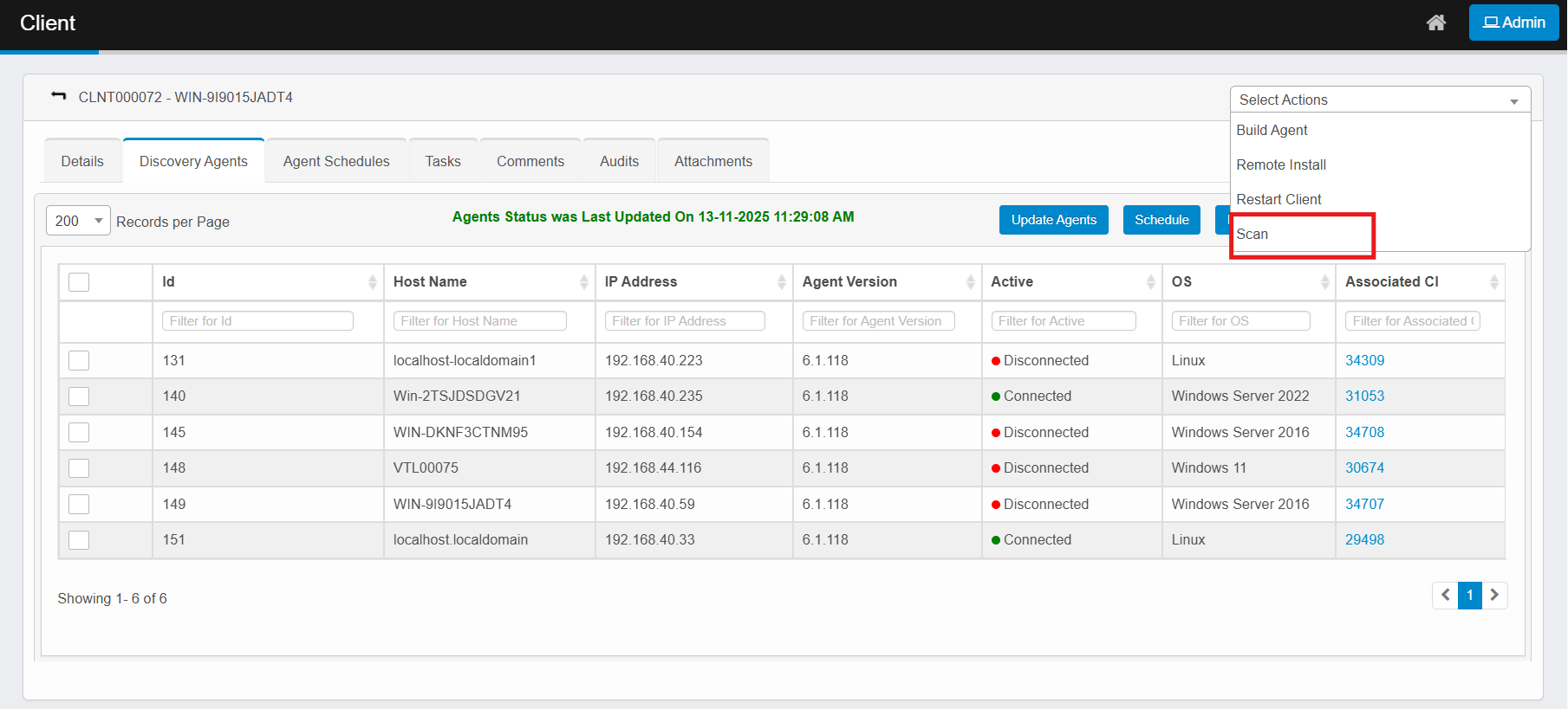 The Scan action appears only if the discovery agent is present. |