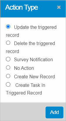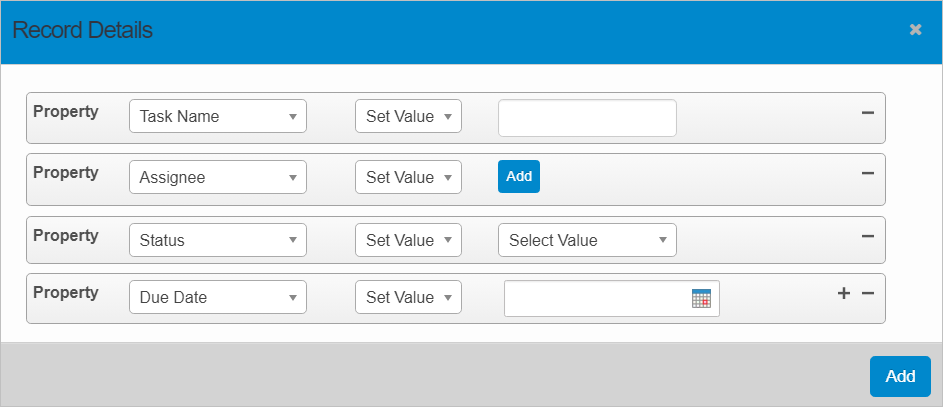 Create Task in Triggered Record. The Record Details dialog box displays. Configure the applicable properties and click Add.