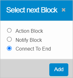 In the Select next Block dialog box, click Connect to End, then click Add. |