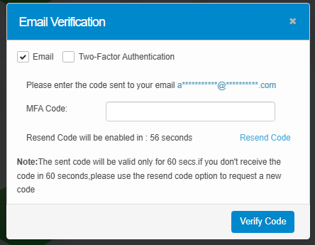 If Email is selected, an MFA code is sent and that code must be entered. If the code is not received, click Resend Code.