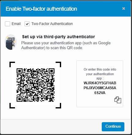 Two-Factor Authentication If Two-Factor Authentication is selected, follow the instructions in this dialog box and do one of the following: If the QR code is scanned, click Continue, check the Google Authenticator app, enter the token, and click Verify Token.