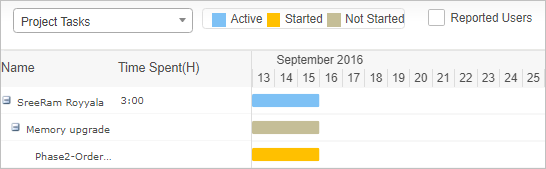 Use this function to view details for a user, such as tasks performed, hours spent on the task, status of a task (such as Active, Started, and Not Started), and dates on which tasks occurred.