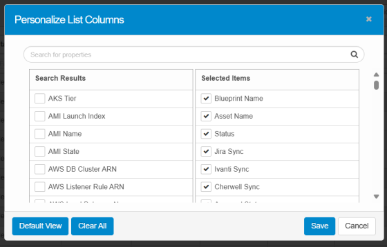 - Under the Selected Items column, a list of all currently selected columns is shown. To add an item to this list, click on the column name in the Search Results list. The selected item is now available in the Selected Items list.