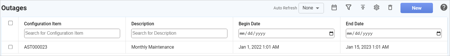 Click New. The New Outage window displays. |