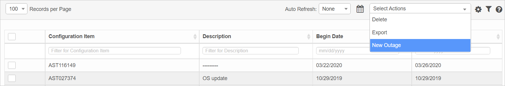 In the main window, select ITSM > Change Management > Outages. The Outages window displays.