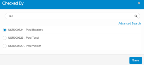 In the Checked By field, click Add+. The Checked By dialog box displays. |