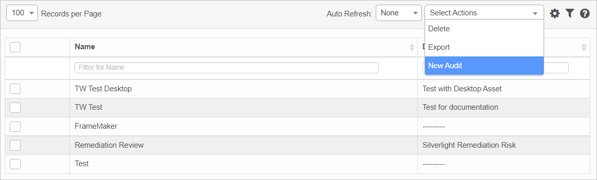 | 1. | From the Select Actions drop-down list, choose New Audit. |