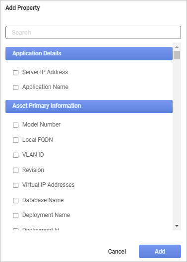 Use this function to add a Property field to the current asset record. The default property data is pre-populated into the field. Added properties are shown in all the configuration items for that blueprint.