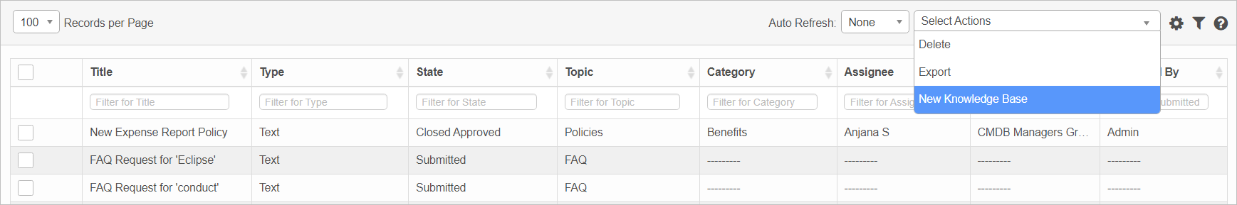 | 1. | From the Select Actions drop-down list, choose New Knowledge Base. The New Knowledge Base Submission window displays. |