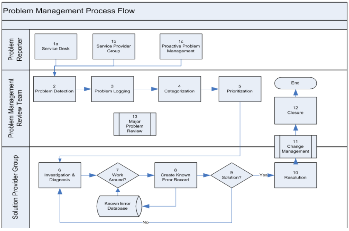 Problem Management includes the activities required to diagnose the root cause of incidents and to determine the resolution to those problems. It is also responsible for ensuring that the resolution is implemented through the appropriate control procedures.