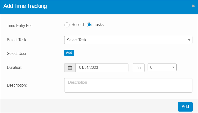 | 1. | To add a new time tracking item, click Add. The Add Time Tracking dialog box displays. |