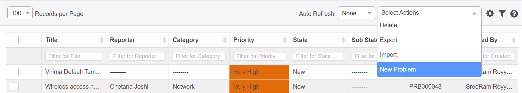 | 1. | From the Select Actions drop-down list, choose New Problem. |