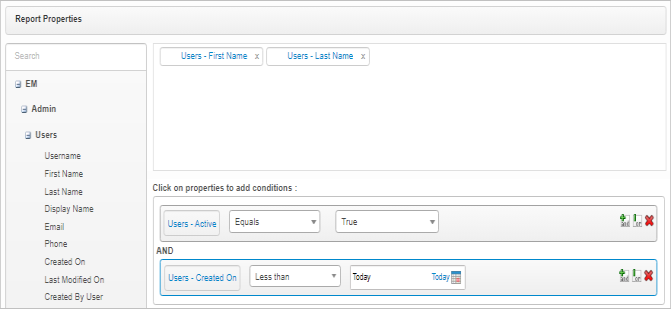 When adding report properties, at least one display field and one condition must be selected before moving to the next step in the process. |